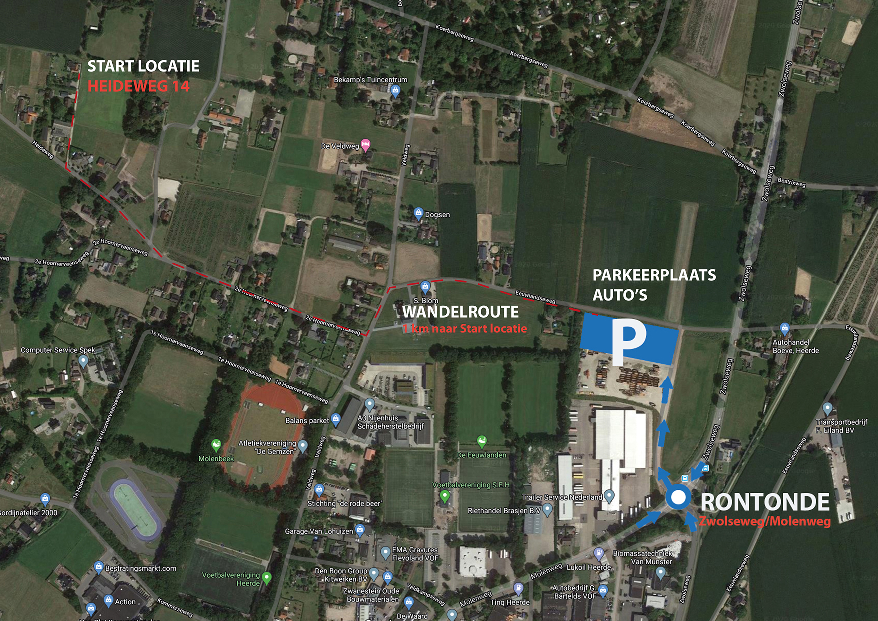 Ben je in de gelegenheid kom dan op de fiets! Kom je met de auto probeer dan te carpoolen. Parkeren met de auto kan op grote materieel-parkeerplaats van Boverhoff, navigeer op Molenweg 1, Heerde maar rij (door) naar rontonde (Zwolseweg/Molenweg) daar staan parkeerwachters bij ingang parkeerplaats. ZIE ONDERSTAANDE KAARTJE!